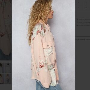 Chic button-down shirt by POL. Soft pink with floral accents. Features front pockets and button closure.