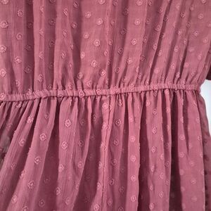 Charming babydoll style pink purple (more of a purple mauve tone) mini swiss dot dress by Umgee. Features delicate lace details and a flattering tie waist. Perfect for any occasion.