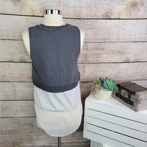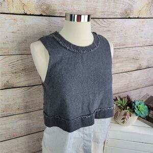 10 Crosby Derek Lam Grey and White Knit Striped Layered Sleeveless Blouse Size 4. Style comes easy in this interestingly-designed blouse from 10 Crosby Derek Lam. It is crafted in a relaxed silhouette with a blend of fabrics into a layered style flaunting a combination of grey and white hues. Featuring a sleeveless style and a round neckline, this blouse make for a stunning casual option. Fabric: 100% Cotton; Combo 1: 96% Cotton, 5% Spandex; Combo 2: 50% Cotton, 50% Polyester; Combo 3: 70% Cotton, 30% Silk