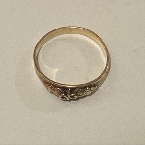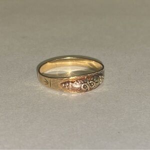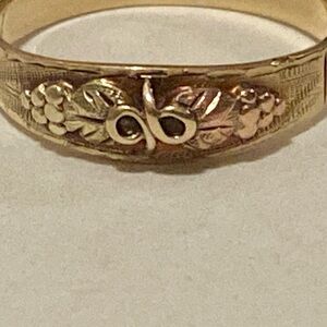 Tags: 10k 12k Solid Gold, Tri-Color Yellow Gold, Black Hills Gold, Grapevine and Leaf, keepsake ring, pinky ring, swirling vines. yellow gold band, Infinity Grape Leaves Band Ring, Jewelry, Vintage Ring, Fine Jewelry, SENTIMENTAL, Black Hills Gold leaves, grape clusters and vines, dainty ring, Black Hills Gold ring, Black Hills of South Dakota, grape leaf and vine designs in 10K yellow, 12K green, and 12K rose gold alloys. Solid Gold. 10kt 12kt. stamped 10/12K tricolored Black Hills gold ring size, leaf motif, infinity sign, ring. 14K Solid Gold,