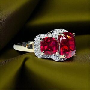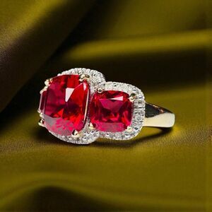 10K Gold- Ruby & Halo Diamond Ring -Size 7- 4 CTTW Three Stone Cushion Cut -3.4g