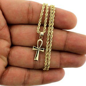 10K Real Gold Rope Chain and Ankh Cross Pendant Set