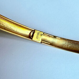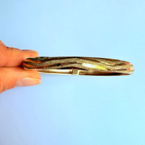Vintage Fancy Classic Chevron Wave embellishment design diamond etched bangle bracelet. 10K solid yellow gold with amazing Tubular hinge constructions that opens up to easily put on with sliding imbedded closure and safety clasp.