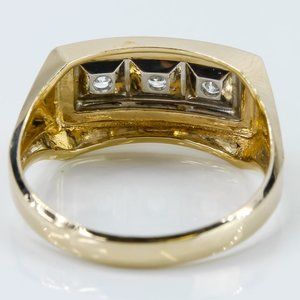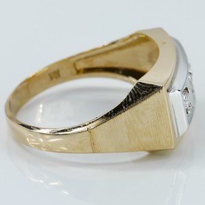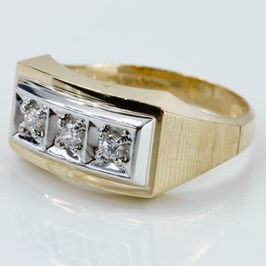 This ring is made of 10 Karat Yellow Gold & features 3 glimmering round Diamonds on the front. Each Diamond is placed within a rectangular frame of White Gold, adding to the already lovely piece. The shoulders of the band have a brushed texture & "10K" is stamped into the inner band. This ring can be resized by any qualified jeweler.