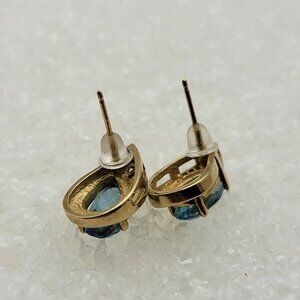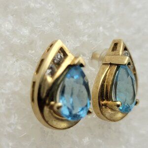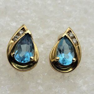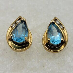 10K Yellow Gold Blue Topaz & Diamond Teardrop Stud Earrings 13mm Vtg. Signed Aj