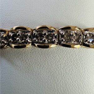 Add a touch of timeless elegance to your jewelry collection with this stunning gold-tone tennis bracelet. Featuring a continuous row of sparkling round-cut diamonds, each securely set in a polished square bezel frame, this piece captures light beautifully from every angle. The bracelet’s sleek design offers both sophistication and versatility—perfect for special occasions or everyday wear.