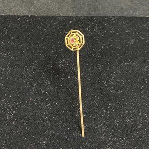 10K Yellow Gold Floral Stick Pin W/Pink Rhinestone