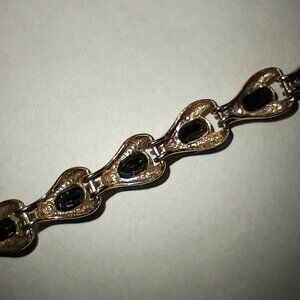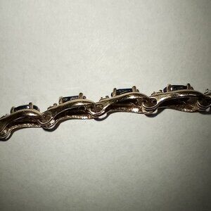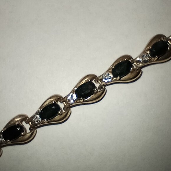 This Bracelet has 10Kt Yellow Gold Boat-Tail-Links with 20 Oval-Cut Blue Sapphire Gemstones (~7.00ctw) accompanied by 20 Round Diamond-Accents (~0. 05ctw).