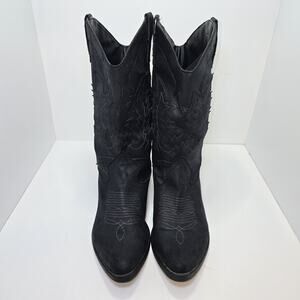 Description Western-inspired Rampage Wallenti boots in versatile black. Faux-suede fabric upper with classic embroidery, pointed toe, and low block heel. Pull-on style with tabs. Great for concerts, rodeo/Nashville trips, or everyday outfits.