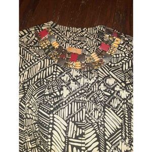 Good Used Condition Women's Size 10P Petite Ruby Rd Petite Denim Tan and Black Tribal Print Waist Jacket, Cardigan, Blazer, Heavy Shirt- Embellished Beaded Neck- Snap Front, Faux Pockets, Cotton