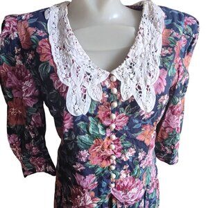10P Vintage 80's Floral Midi Granny Cottage Dress With Lace Collar & Tied Waist