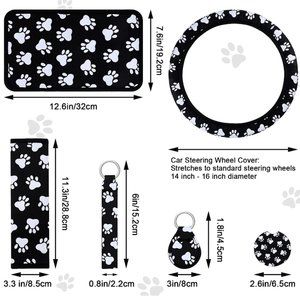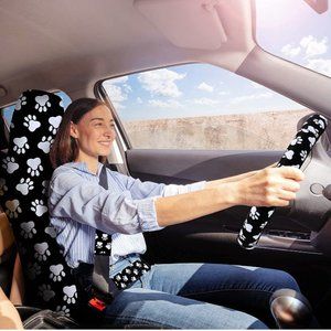 Give your car a fashionable look & save big buying as a set! (listed individually totals approx $175) -Includes Paw Print car seat covers, 2 seat belt covers, 2 coasters, 1 steering wheel cover, 1 center armrest pad, 1 key chain & 1 wrist strap