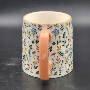 This is a 14-ounce coffee mug from 10SS, Artisan Collection. The mug is white with a peach handle and rim. Multiple colors are used in the design depict images of flowers and leaves. The outside of the mug is dimpled. The mug is 4" tall and 3.5" across the mouth. Wording on the bottom of the mug indicates that it is microwave and dishwasher safe.