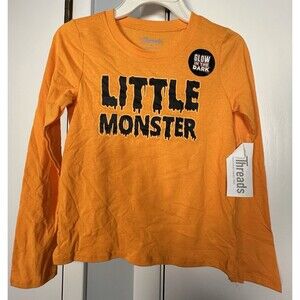 The 10Threads Little Monster Long Sleeve T-shirt in size 10 Kids is a fun and stylish activewear option for children. Made from 100% cotton with a pullover closure and round neckline, this orange shirt features a Halloween theme with glow-in-the-dark details. The classic fit and basic style make it suitable for both casual wear and playtime, while the machine washable fabric ensures easy care. Perfect for the fall season, this unisex kids' t-shirt from 10Threads is sure to be a hit with any young monster fan.