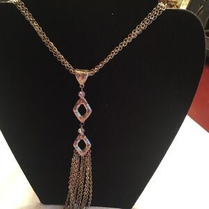 Goldtone triple chain with a length of 25” feeds into a double diamond plaque each with crystal holding a chain tassel, adding another 7 1/2” to the necklace length. Very gently used as shown in photos. Features a lobster claw clasp.