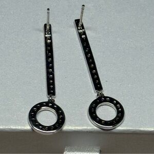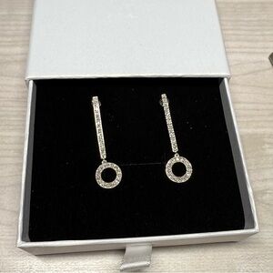 These silver earrings feature a minimalist geometric design with a vertical bar adorned with clear crystals, leading to a simple circular drop. The modern and symmetrical style adds a touch of sophistication to any outfit.
