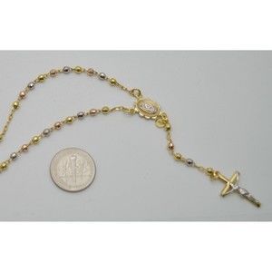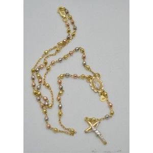 10k solid yellow gold colored beads rosary virgin mary Jesus cross necklace 17"! Solid real 10k yellow gold rosary with crucifix Jesus and oval two-sided virgin mary and cross pendant. Beautiful sparkling colored 3 mm beads.