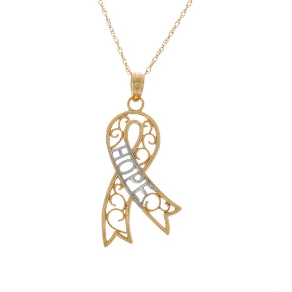 10k Two-Tone Gold Filigree Cancer Hope Ribbon Charm Pendant Necklace with 18" Chain