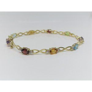 You are viewing a 10k Yellow Gold Natural Multi-Stone Link Bracelet featuring oval faceted gemstones, prong-set in a high polished link bracelet. The bracelet is 7 inches in length and is secured with a locking arm clasp.
