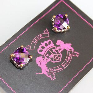 Beautiful Dark Purple Cz with brilliant sparkle set in this detailed two tone finish earrings. The cushion cut, or faceted checker cut as some call it, allows this gem to sparkle from every angle. These earrings have 3mls of rhodium (white gold) and yellow gold electroplating for super long lasting wear. The stone measures about 10mm x 10mm in diameter. These amazing Cz Earrings are post style in the CENTER which do not droop! VERY FLATTERING! Super sparkle clear!