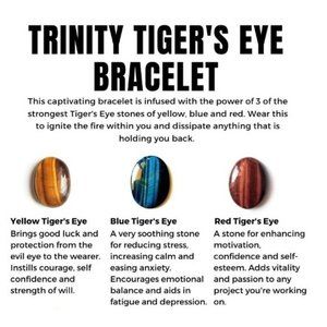 The Trinity Tiger's Eye Bracelet is infused with the power of 3 of the strongest Tiger's Eye stones of yellow, blue and red. Wear this to ignite the fire within you and dissipate anything that is holding you back