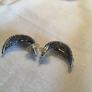 These are post and clutch backs which have a 1” drop. Crescent moon shaped, they have 3 blue bezel set stones and measure 1/2” at their widest point. Very gently used as you can see in front and back photos. Almost forgot, they are a silvertone metal.