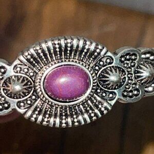 2 bracelets - purple stone and silver cuff bracelet. The bracelet is a dainty silver cuff with a vivacious purple stone at the center