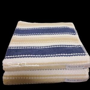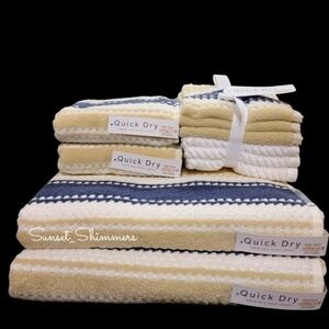 Here we have a New with tags, 10 piece Quick Dry, Tan, blue and white, striped 100% Zero Twist Cotton Bath, Hand, washcloth Towel Set: (2) Bath (2) Hand (6) Washcloth Towel Set. (There are 3 striped /colored washcloths and 3 white washcloths in the pack) Sooooo pretty!