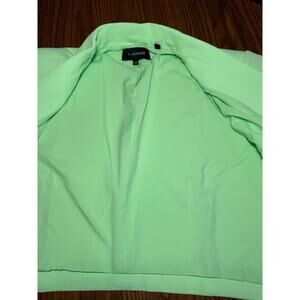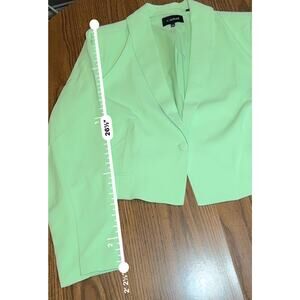 The pistachio green color of this cropped blazer offers a unique and unexpectedly appealing choice. Its stretch crepe material, along with front seam details and a single button closure, complements its cropped length, ensuring a true-to-size fit for a stylish and comfortable wear.
