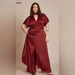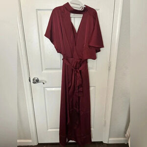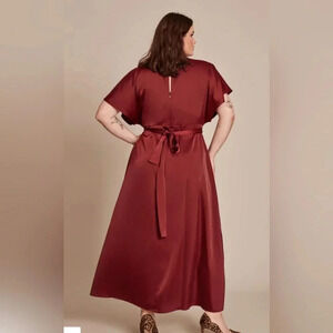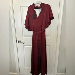 The Precious is a high-necked wrap dress cut from a mid-weight textured satin. It is intended to fit loose though the top, fitted at the waist, and flares out to a full skirt. Featuring dolman flutter sleeves, a surplice neckline, and faux wrap skirt, use the removable self-tie belt to cinch the waist.