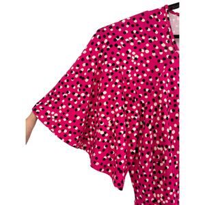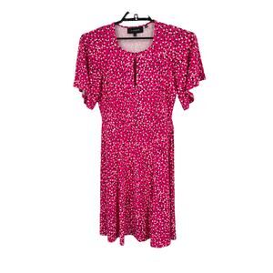 color: printed pink print, center keyhole, short sleeves, jewel neck, flared skirt, above knee length, spot print
