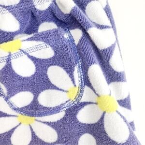 Mini Boden terry cotton purple shorts with white and yellow daisy print. Features a pink drawstring.