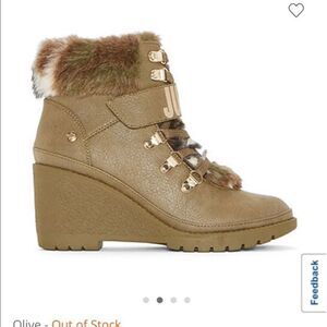 Black faux leather wedge with black fur accent neon/fluorescent/hot pink laces/lacing Silvertone hardware and metallic silver strap/band