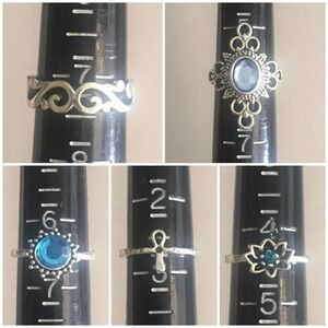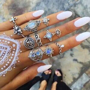 11 piece boho trendy knuckle ring set. Faux blue sapphires in select rings. Rings include turtle, cross, lotus, waves, flower, and om symbol. Ring sizes vary 2.75 to 8 (specific ring sizes are shown in photos) and are sold as a set (cannot be separated). Material is a silver toned zinc alloy. Keep dry and away from oils and lotions.