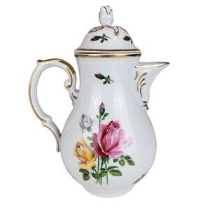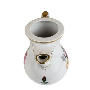 Tea, coffee or espresso for 3? This gorgeous vintage tea set is in excellent vintage condition - it's actually antique, over 50 years old and has been in our family a long time. Set includes teapot and lid, three cups and three saucers, sugar bowl with lid, and creamer. The cups are small size slightly over 2" high and hold about 3.5 oz. Please note the only flaws I could find: very tiny chip on inside rim of the sugar bowl, another small chip on the bottom of the sugar bowl, and slight amount of gold rubbed off on creamer handle. Set was purchased at an antique store and never used, just displayed.