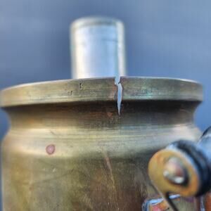 - The top part of the samovar has two natural cracks along the lip. The top lid does not close properly due to the cracks that expand the rim.