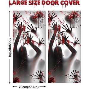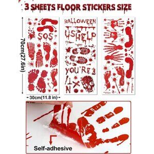 Clear and realistic bloody patterns: Each giant door cover is 61inch (155cm) x 27.6inch(70cm), window cling and floor cling is 27.6inch (70cm) x 11.8inch (30cm). These bloody hand and foot printed Halloween decorations are clearly printed, with vivid patterns, bright colors but not fading.