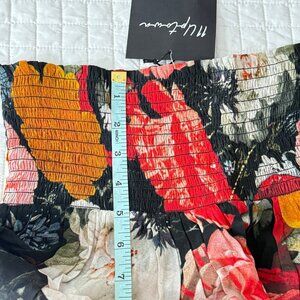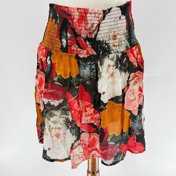 Versatile skirt featuring a vibrant floral print with bold red, orange, and black hues. Designed with a comfortable smocked waistband and crafted from a lightweight cupra and viscose blend, unlined, for effortless styling.