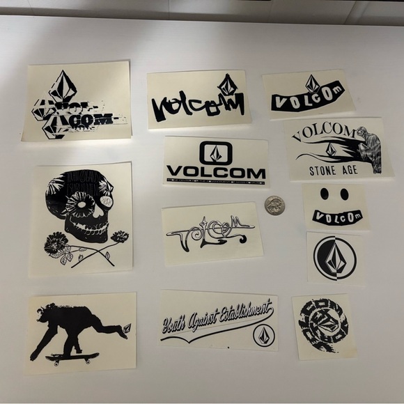 Diverse set of Volcom stickers. Features bold black and white designs. Ideal for personalizing items.