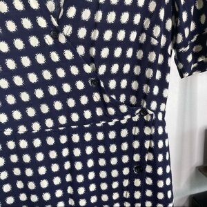 Size XS. Navy blue with cream colored polka dots. Small off center breast pocket. Buttons lining the wrap part- can be left buttoned or unbuttoned if you want a higher slit. Asymmetrical tulip hem. Cuffed sleeves. SUPER cute and sexy. Retro 60s vibe.