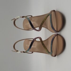 BCBGeneration heels, rhinestone heels, rainbow sandals, party shoes, stiletto heels, open toe sandals, dressy heels, size 8 heels, crystal strap shoes, glam heels, NWT shoes, women’s sandals, special occasion shoes