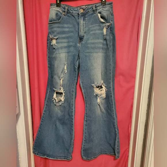 Rue 21/distressed jeans/wide legs/cut up/loose fit/button/zipper front/pockets/belt loops/size 11