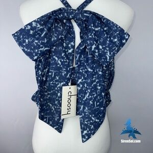 This Choosy top is a statement piece designed with both drama and charm. The ruched bodice offers a flattering fit, while the wide straps cross at the back to support an oversized bow that sits high between the shoulder blades. Crafted in a textured blue abstract print with a soft woven feel, it blends playful detailing with a chic silhouette. Perfect for pairing with high-waisted denim for day looks or sleek skirts for night outings, this versatile top ensures standout style across seasons.