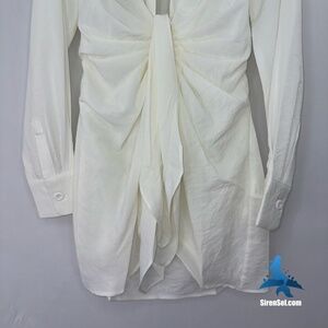 modern minimal dress, knotted front detail, crisp tailored style, versatile mini, collared plunge look, structured drape, evening chic, polished daywear, contemporary silhouette, sleek white outfit