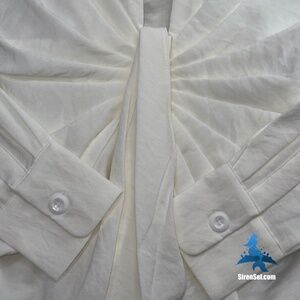 The Choosy Dress delivers a polished yet effortless look with its sleek tailoring and flattering draped detail. Crafted in crisp white fabric, it features a deep V-neckline balanced by a sharp collar and long sleeves with button cuffs. The center knot twist cinches the waist and adds soft structure, while the tailored skirt elongates the silhouette. Perfectly versatile, this piece transitions from day to night—pair with heeled boots and gold jewelry for modern sophistication or style it with sandals for an elevated casual vibe.