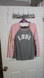 Cozy sweatshirt with 'LOVE' graphic. Soft pink sleeves and gray body.