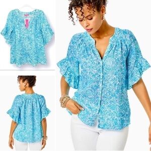 This Lilly Pulitzer Tayla short sleeve top is a must-have for any fashion-forward woman. The V-neckline and button closure provide a classic look, while the flutter sleeves add a touch of femininity. Made of high-quality linen material, this top is perfect for warm weather and can be worn in the summer and spring seasons. The relaxed fit makes it comfortable to wear, and the blue color adds a pop of color to any outfit. This top is available in size 2XS and is perfect for any occasion.