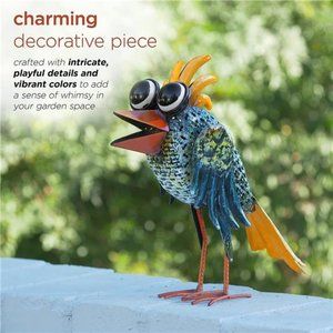 Add vibrant color and a sense of whimsy to your beautiful garden and yard with this 11" Tall Outdoor Metal Wide-Eyed Bird Standing Yard Statue Decoration from Alpine Corporation. The garden figurine features a quirky, multi-colored, wide-eyed bird statue that makes an original statement piece, while bringing a warm, inviting welcome to your front yard or entryway. Constructed from durable 100% weather-resistant metal, the yard decoration is sturdy and stable for years of quality use on your lawn or porch. The outdoor statue features intricate and realistic playful details on the sculpture that add a bold statement to your patio or garden. Add one or multiple statues to create an enchanted garden display. Revamp your landscaping with this vibrantly colored bird statue.