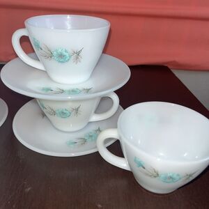 11pc ANCHOR HOCKING FIRE KING CUPS & SAUCERS Boutonnière Tea Rose Bonnie Blue