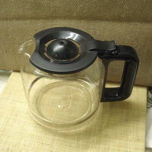 Replacement carafe for a 12 cup coffee maker. Clear glass with brown plastic handle and lid. About 6 1/4 inches high, 8 inches from spout to handle. 5 1/2 inches bottom diameter. No chips or cracks. No plastic breaks.